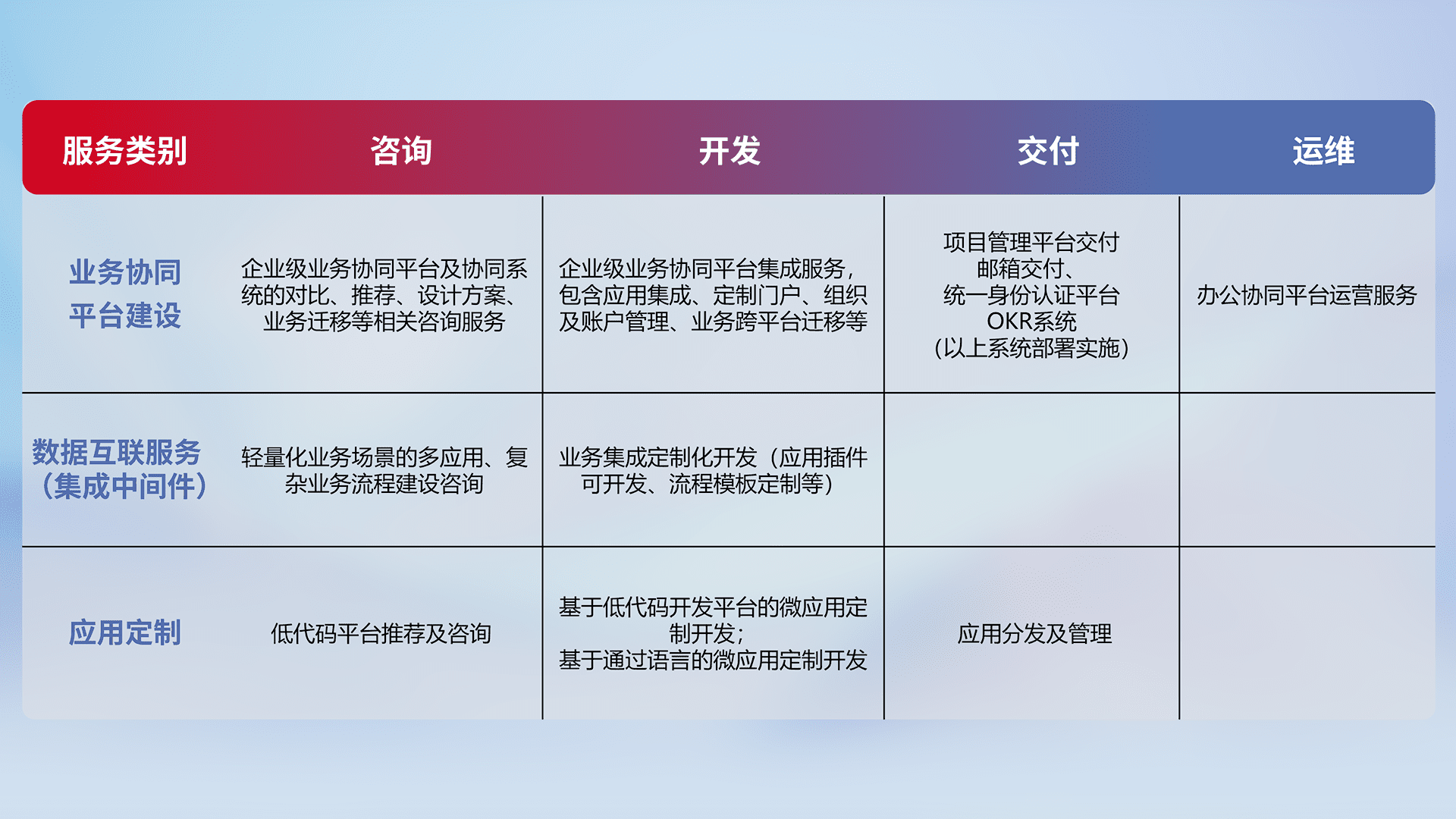 针对钉钉、、、、企微、、IDaas等平台级产品提供产品的规划、、、方案、、、交付、、、、定制化开发等服务,,,实现如统一协同办公、、、、智能客户服务、、、混合会议管理、、智能数据查询、、、等业务场景,,,实现数字化转型。。。