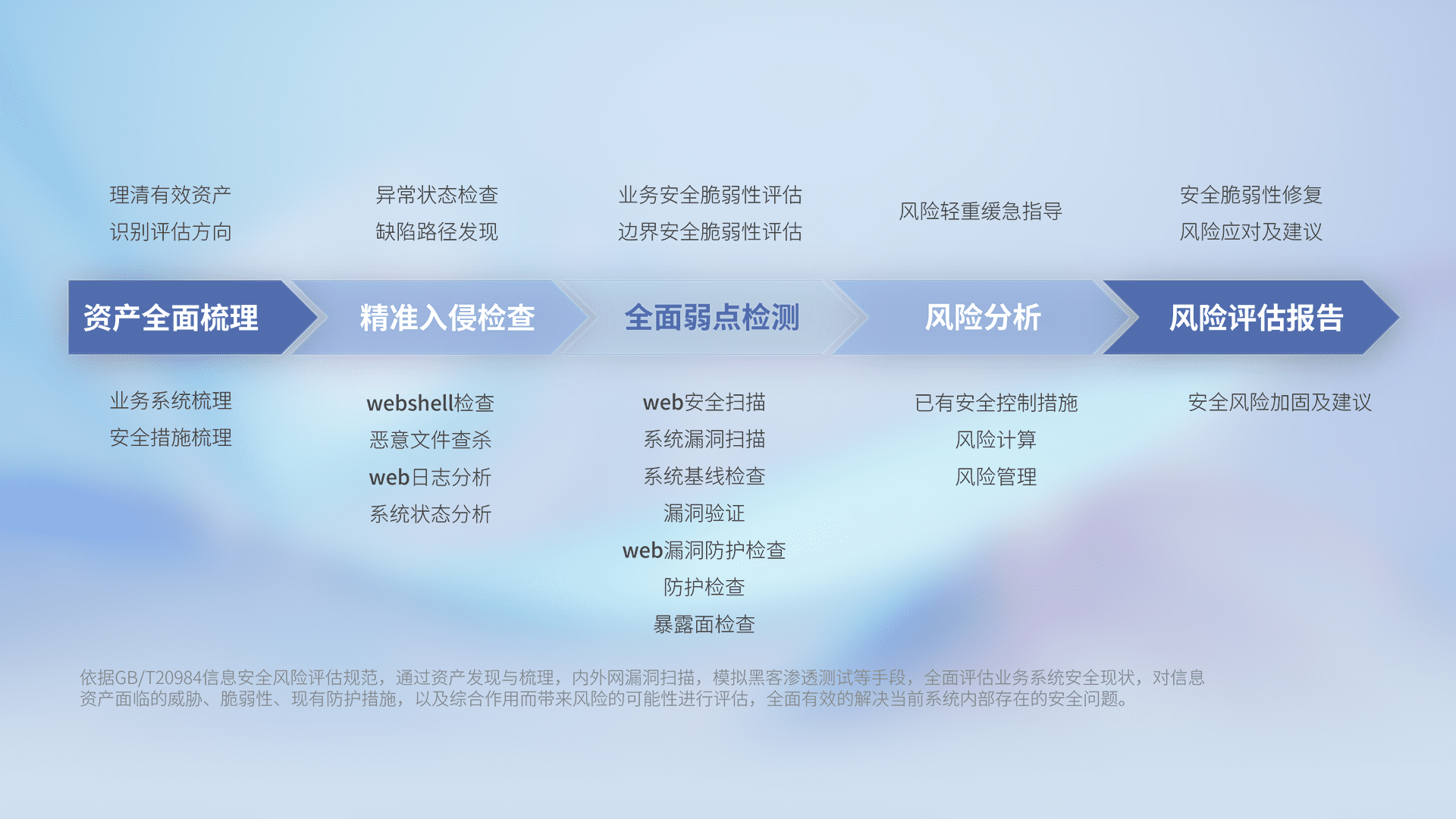 针对客户行业特性,,,以专业的安全服务+多厂商联合解决方案提供专属的一站式安全管理服务,,,,帮助客户全面感知网络空间威胁,,基于识别、、、、检测、、、分析、、、防护、、、监测、、、响应的服务理论模型,,从方案咨询、、、集成交付、、、、评估验证、、优化加固、、运维运营,,,,致力于为客户提供完整的闭环管理式安全服务。。。以实战经验为客户打造高抵御风险的安全体系,,,帮助客户发现威胁、、对抗威胁、、、处置威胁,,不断积累安全对抗能力,,,,持续保障数字化安全。。。。